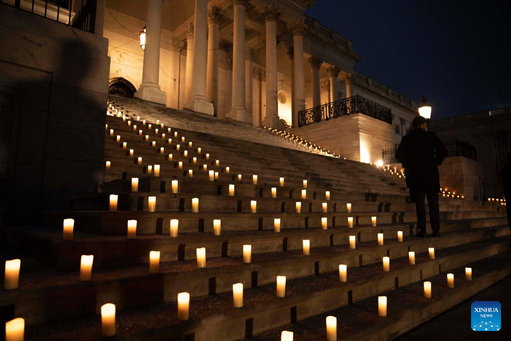 A U.S. national flag flies at half-staff and candles are lit at the U.S. Capitol Building to mark the anniversary of the Jan. 6 attack on the Capitol in Washington, D.C., the United States, Jan. 6, 2022. (Photo by Aaron Schwartz/Xinhua)