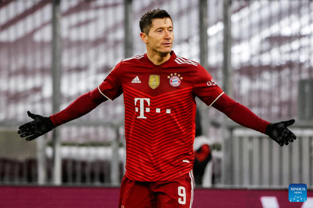 Robert Lewandowski of Bayern Munich reacts during a German Bundesliga match between Bayern Munich and Borussia Moenchengladbach in Munich, Germany, on Jan. 7, 2022. (Photo by Philippe Ruiz/Xinhua)