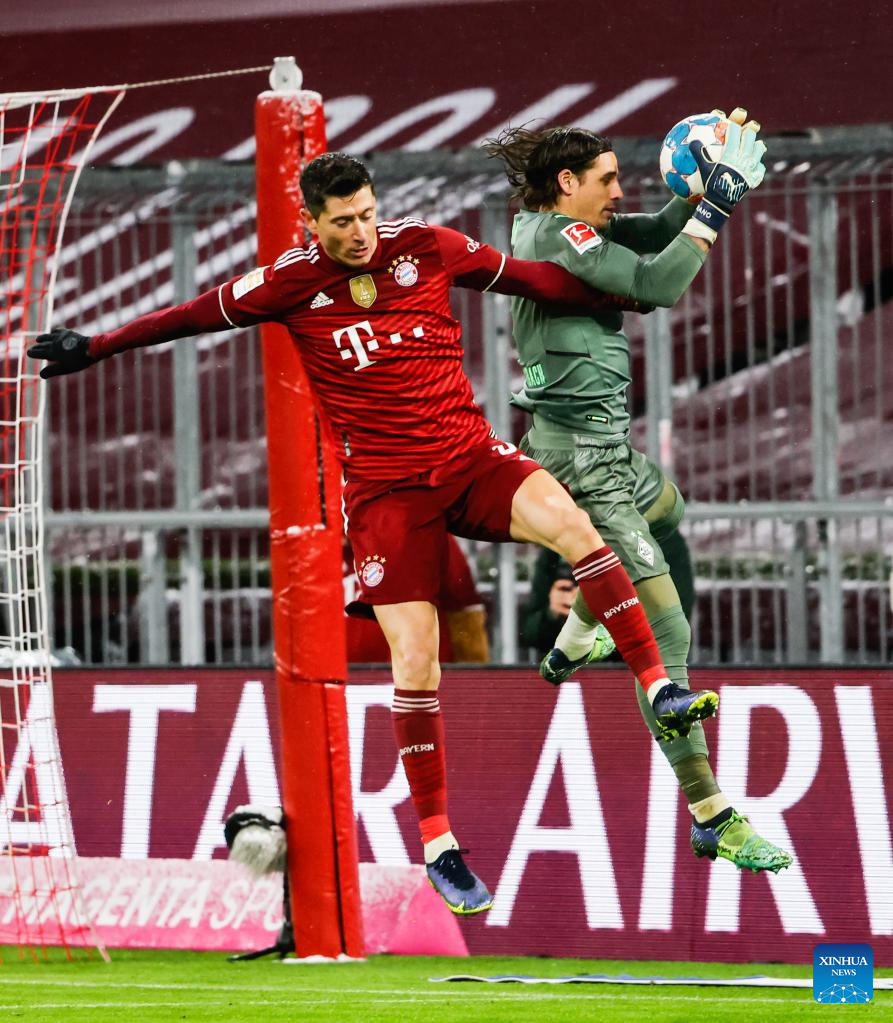 Robert Lewandowski (L) of Bayern Munich vies with goalkeeper Yann Sommer of Moenchengladbach during a German Bundesliga match between Bayern Munich and Borussia Moenchengladbach in Munich, Germany, on Jan. 7, 2022. (Photo by Philippe Ruiz/Xinhua)