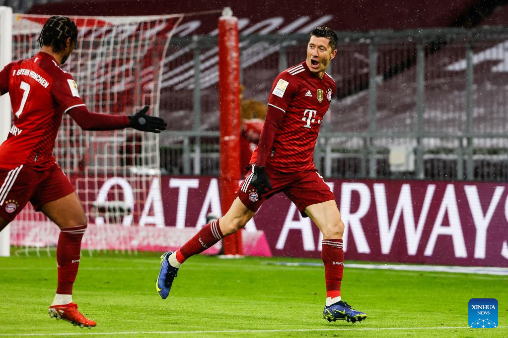 Robert Lewandowski (R) of Bayern Munich celebrates his scoring during a German Bundesliga match between Bayern Munich and Borussia Moenchengladbach in Munich, Germany, on Jan. 7, 2022. (Photo by Philippe Ruiz/Xinhua)