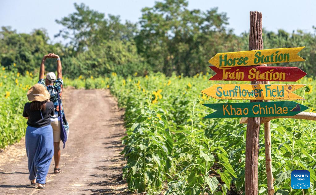 Tourists take pictures in sunflower fields in Lopburi, Thailand, Jan. 6, 2022. Lopburi province is famous for a large sunflower plantation in Thailand. From November to January, the golden sunflower fields attract many tourists. (Xinhua/Wang Teng)