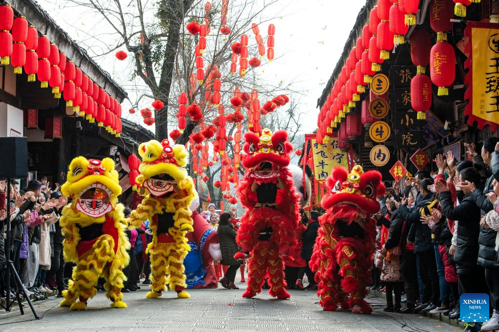 People perform lion dance at Langzhong ancient town in southwest China's Sichuan Province, Jan. 8, 2022. Folk artisans put on a performance here Saturday as the Spring Festival is drawing near. (Photo by Wang Yugui/Xinhua)