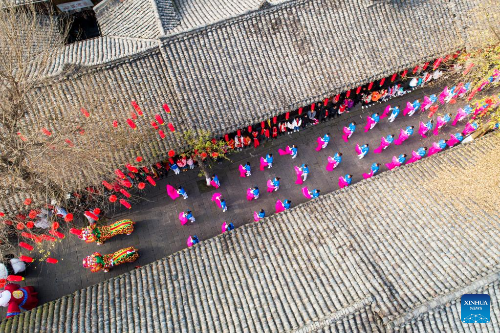 Aerial photo taken on Jan. 8, 2022 shows people performing silk fan dancing at Langzhong ancient town in southwest China's Sichuan Province. Folk artisans put on a performance here Saturday as the Spring Festival is drawing near. (Photo by Wang Yugui/Xinhua)