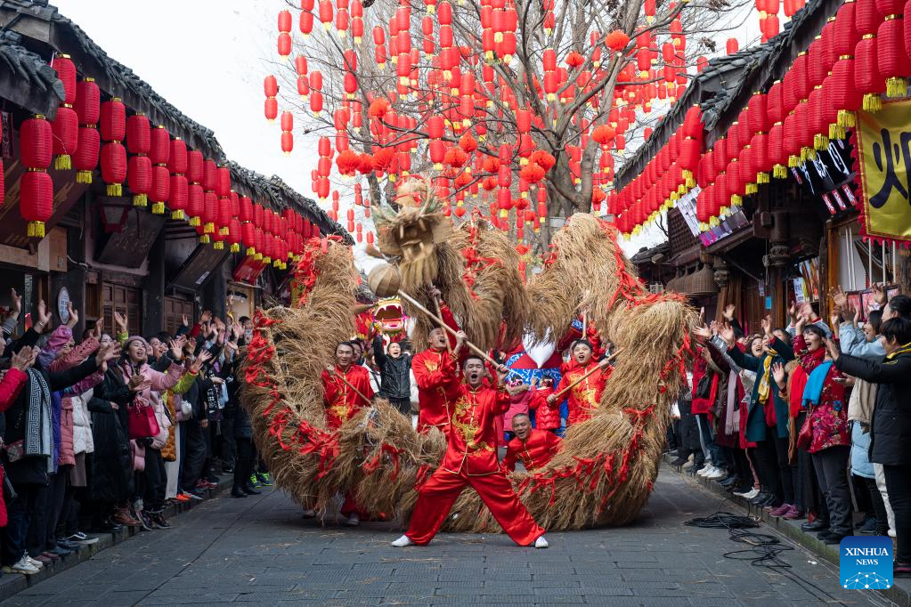 People perform folk dancing of a dragon made of grass at Langzhong ancient town in southwest China's Sichuan Province, Jan. 8, 2022. Folk artisans put on a performance here Saturday as the Spring Festival is drawing near. (Photo by Wang Yugui/Xinhua)