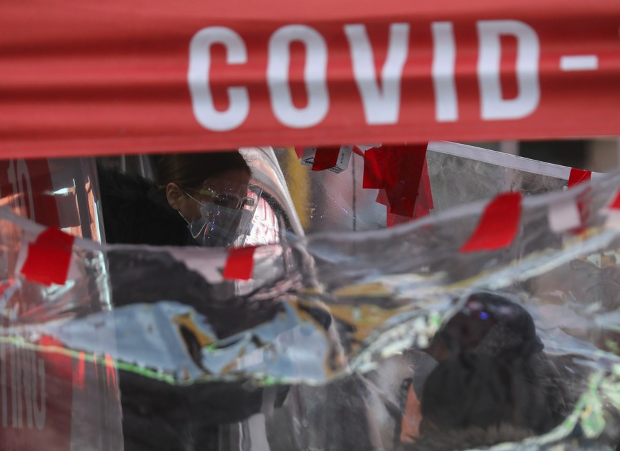 A medical worker works at a COVID-19 testing site on Times Square in New York, the United States, Jan. 4, 2022. (Xinhua/Wang Ying)