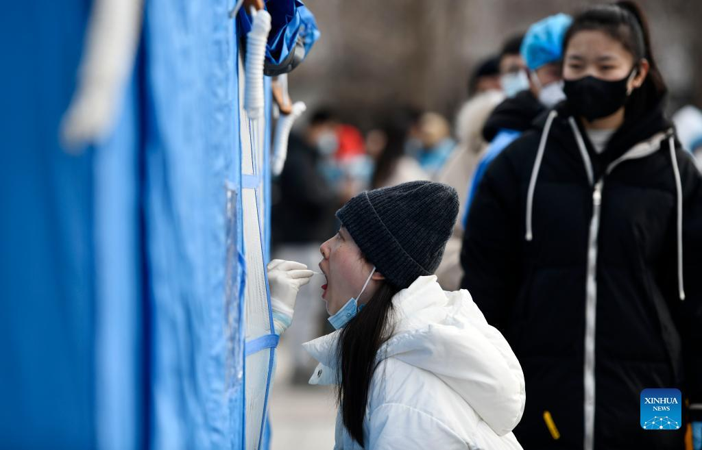 A medical worker takes a swab sample from a citizen for nucleic acid test at a testing site in Binhai New Area in north China's Tianjin, Jan. 9, 2022. North China's Tianjin, a municipality that neighbors Beijing, has decided to start a citywide nucleic acid testing after 20 people tested positive for COVID-19, authorities said Sunday. The infections were reported from 6 p.m. Friday to 9 p.m. Saturday in Jinnan District, and the gene sequencing found the first two locally transmitted confirmed cases were infected with the VOC/Omicron variant, according to the municipal headquarters for COVID-19 prevention and control. (Xinhua/Zhao Zishuo)