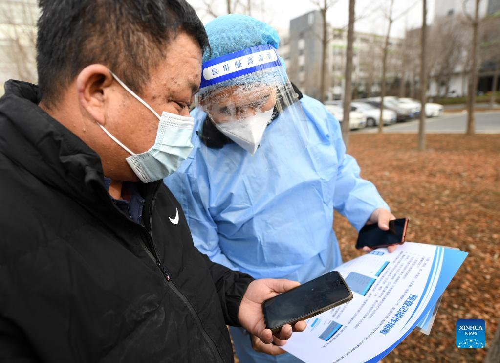 A staff member helps a citizen go through registration procedure for nucleic acid test at a testing site in Binhai New Area in north China's Tianjin, Jan. 9, 2022. North China's Tianjin, a municipality that neighbors Beijing, has decided to start a citywide nucleic acid testing after 20 people tested positive for COVID-19, authorities said Sunday. The infections were reported from 6 p.m. Friday to 9 p.m. Saturday in Jinnan District, and the gene sequencing found the first two locally transmitted confirmed cases were infected with the VOC/Omicron variant, according to the municipal headquarters for COVID-19 prevention and control. (Xinhua/Zhao Zishuo)