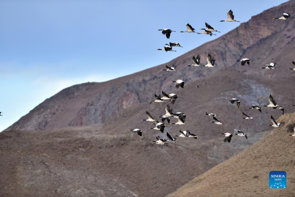 Black-necked cranes fly in Lhunzhub County of Lhasa, southwest China's Tibet Autonomous Region, Jan. 8, 2022. The population of black-necked crane is estimated to reach nearly 10,000 in Tibet, according to the regional department of ecology and environment. (Xinhua/Huang Huo)