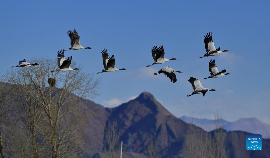 Black-necked cranes fly in Lhunzhub County of Lhasa, southwest China's Tibet Autonomous Region, Jan. 8, 2022. The population of black-necked crane is estimated to reach nearly 10,000 in Tibet, according to the regional department of ecology and environment. (Xinhua/Zhang Rufeng)