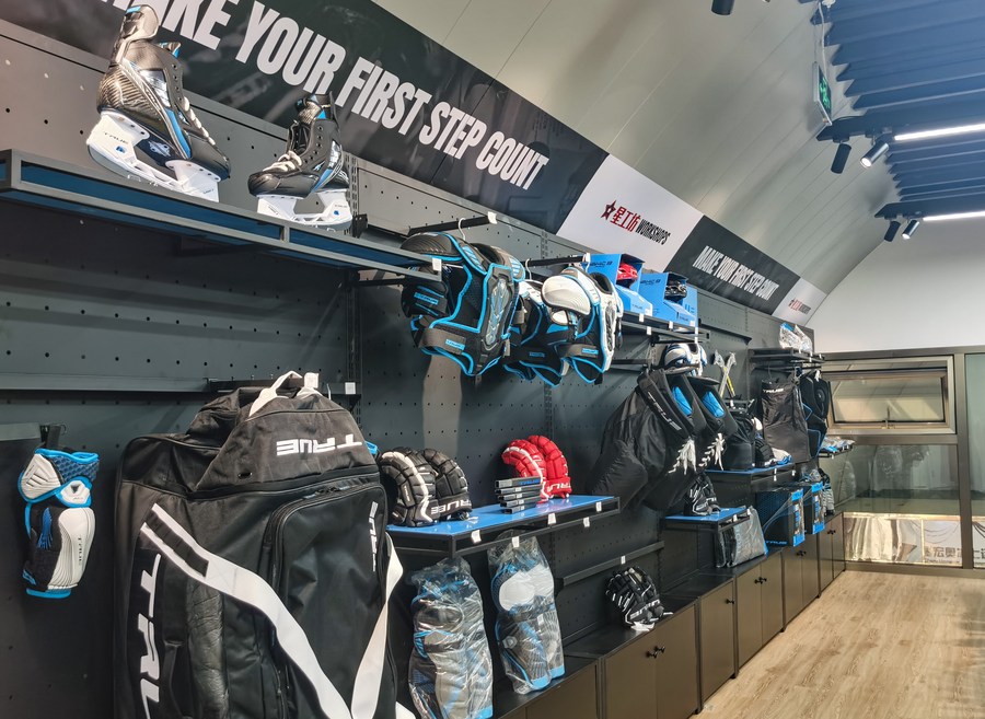 Photo taken with a mobile phone on Jan. 6, 2022 shows products at the ice hockey equipment brand TRUE store in an ice sports center in Beijing, capital of China. (Xinhua)