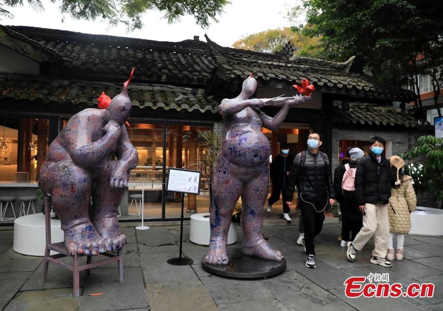 Photo taken on January 9, 2022 shows sculptures of rap pottery figurines in Kuanzhai Alley, Chengdu City, southwest China's Sichuan Province. (Photo: China News Service/Wang Lei)