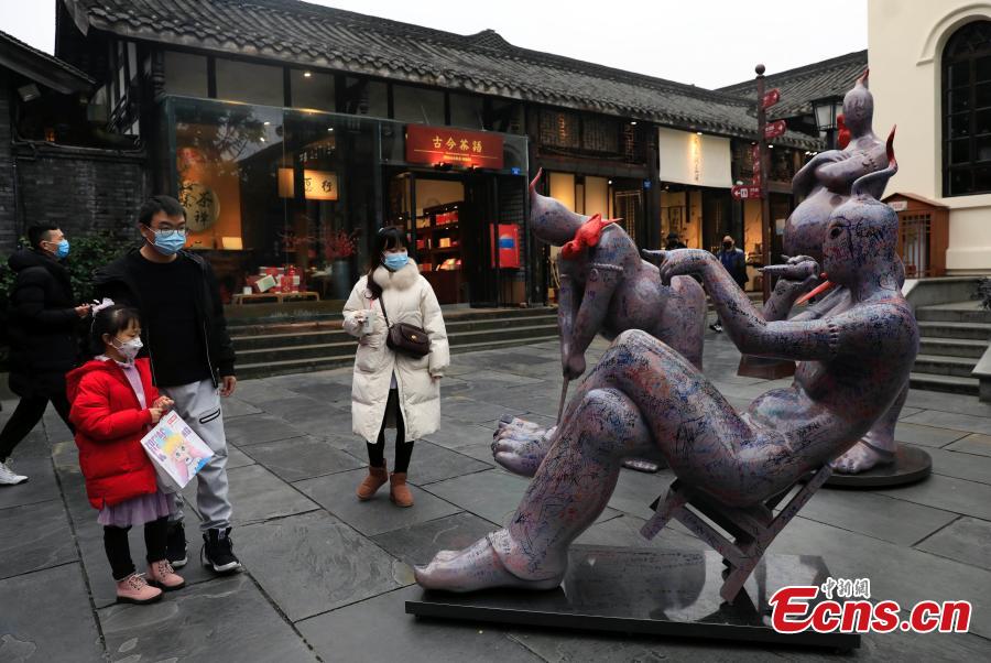 Photo taken on January 9, 2022 shows sculptures of rap pottery figurines in Kuanzhai Alley, Chengdu City, southwest China's Sichuan Province. (Photo: China News Service/Wang Lei)
