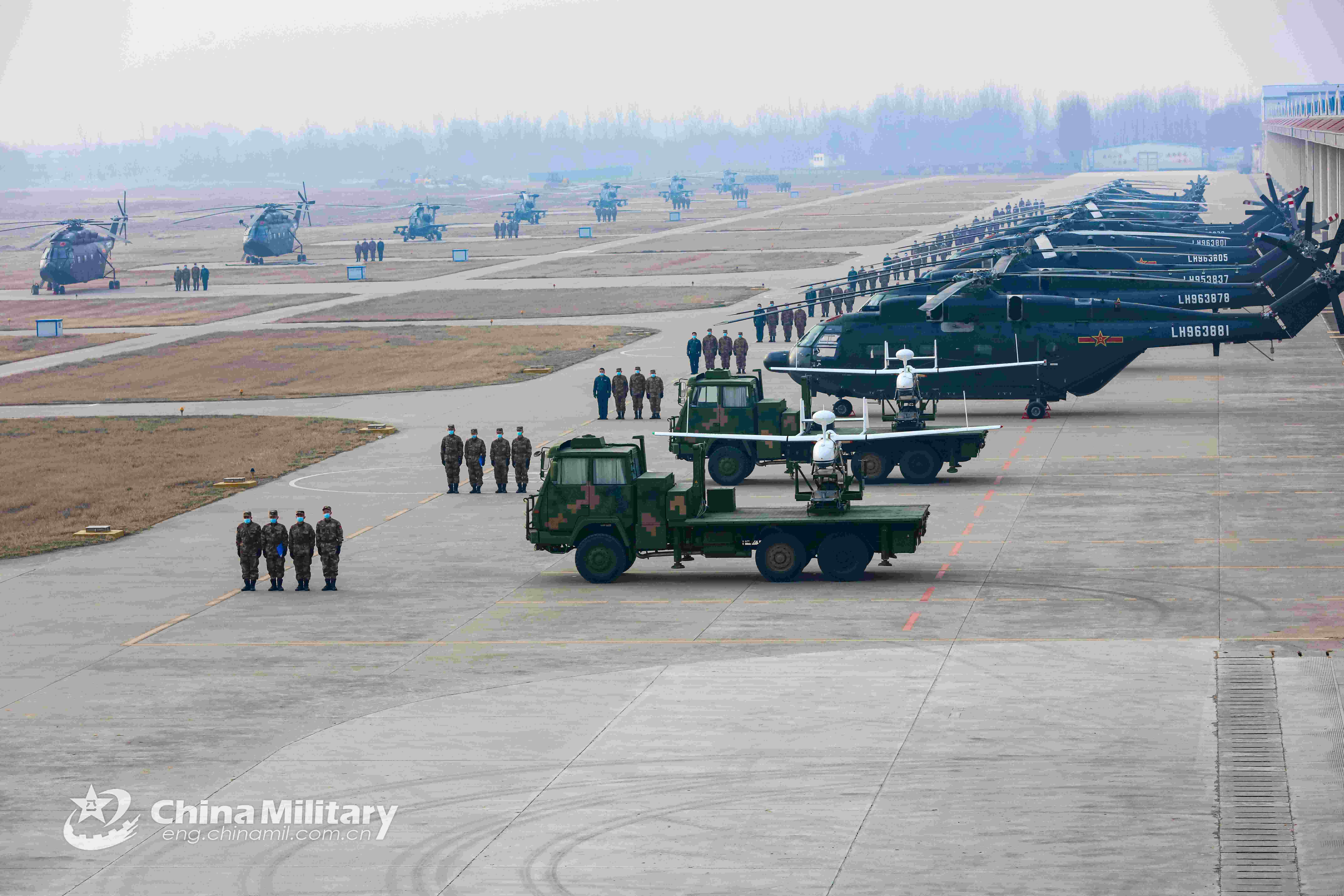 To implement the mobilization order of the Central Military Commission (CMC) for military training in 2022, soldiers and helicopters assigned to an army aviation brigade under the 80th Group Army participate in a mobilization ceremony on January 4, 2021. (eng.chinamil.com.cn/Photo by Li Yuchen and Li Peng)