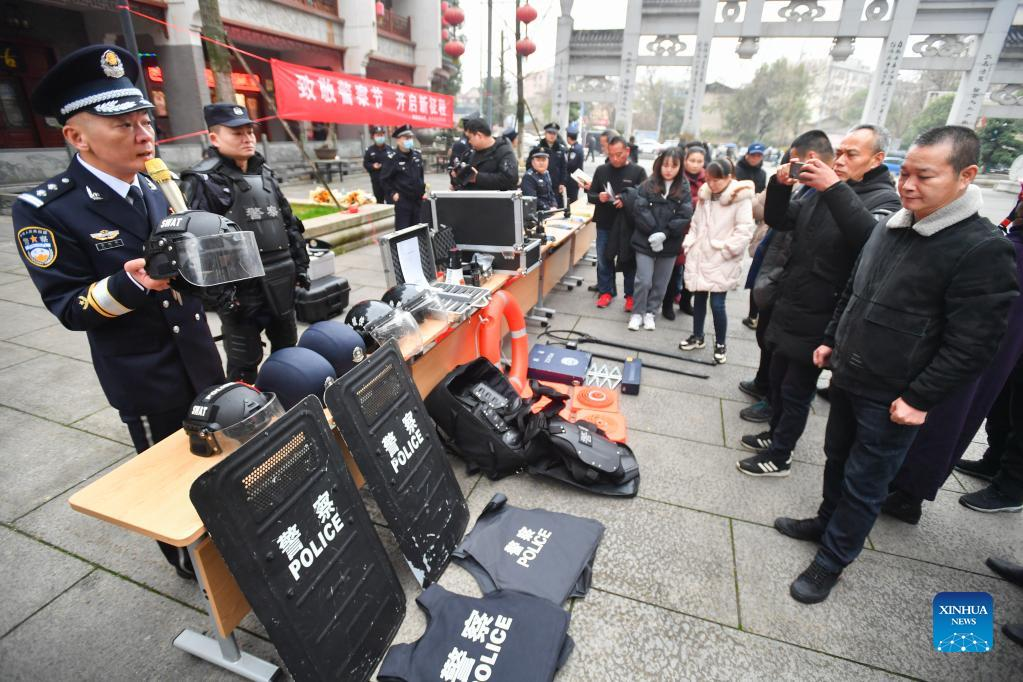 Police officers display police equipments in Xiangtan City, central China's Hunan Province, Jan. 10, 2022. Activities were held to mark the second Chinese People's Police Day, which falls on Monday. (Xinhua/Chen Zeguo)