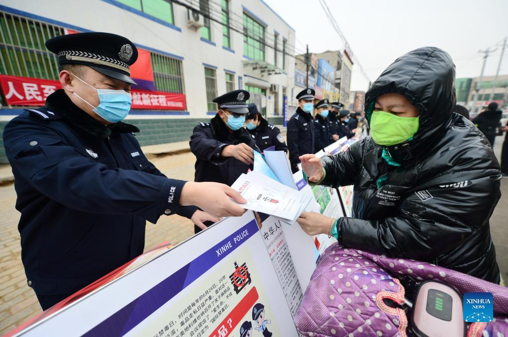 Police officers distribute anti-drug publicity leaflets to locals in Xinhe County, north China's Hebei Province, Jan. 10, 2022. Activities were held to mark the second Chinese People's Police Day, which falls on Monday. (Xinhua/Wang Xiao)
