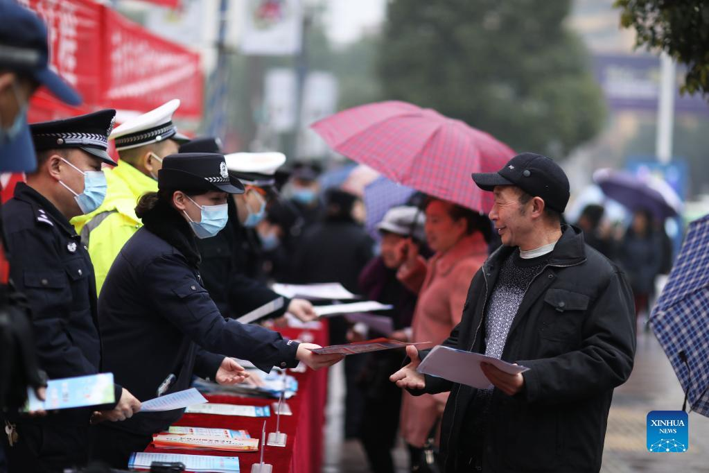 Police officers distribute leaflets to citizens in Chishui City, southwest China's Guizhou Province, Jan. 10, 2022. Activities were held to mark the second Chinese People's Police Day, which falls on Monday. (Photo by Wang Changyu/Xinhua)