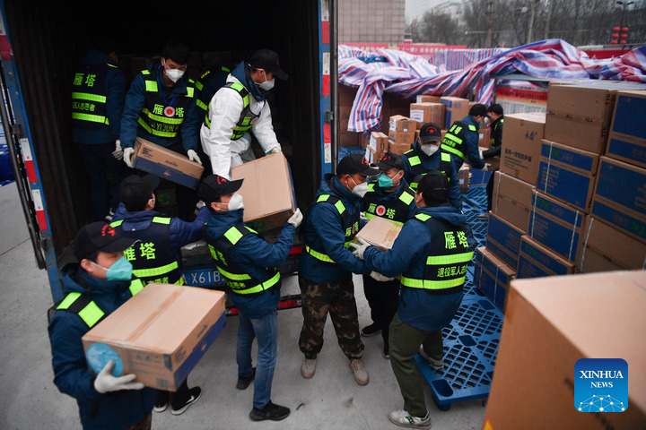Volunteers unload anti-epidemic supplies from a van in Yanta District of Xi'an, capital of northwest China's Shaanxi Province, Jan. 6, 2022. (Xinhua/Zhang Bowen)