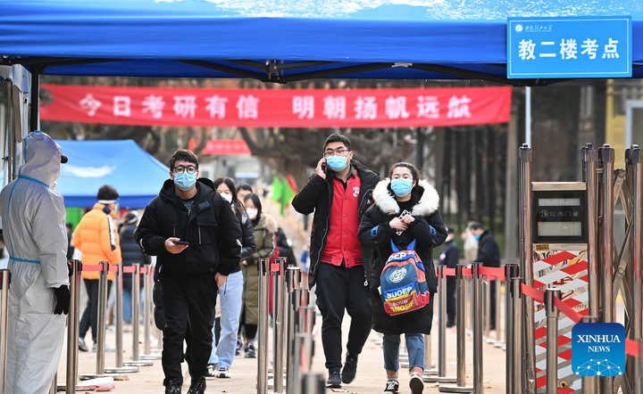 Examinees leave a venue of the postgraduate entrance exam at Xi'an University of Technology in Xi'an, northwest China's Shaanxi Province, Dec. 26, 2021. (Xinhua/Tao Ming)