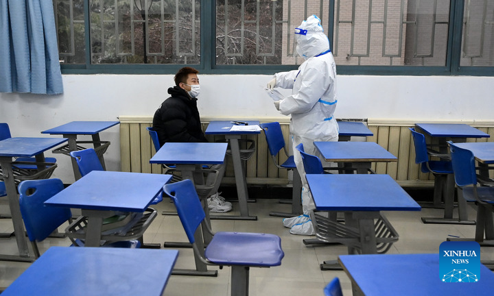 An invigilator checks the information of an examinee taking the national postgraduate entrance examination at a quarantine exam room in Xi'an, northwest China's Shaanxi Province, Dec. 25, 2021. (Xinhua/Liu Xiao)