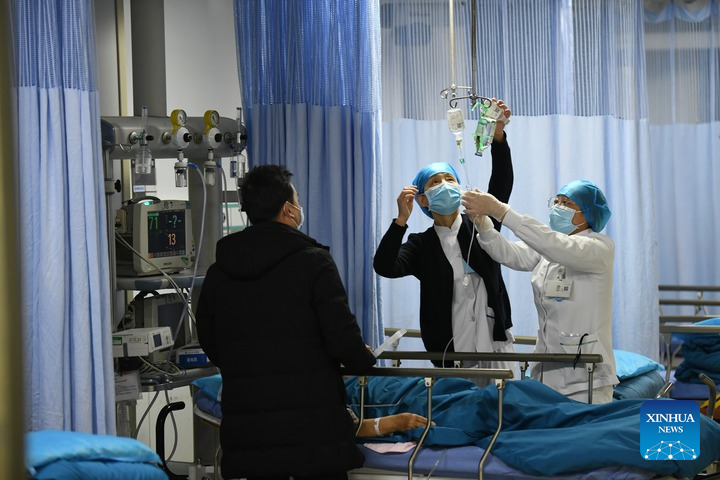 Medical staff give an infusion to a patient at the 1st Affiliated Hospital of Xi'an Jiaotong University in Xi'an, northwest China's Shaanxi Province, Dec. 27, 2021. (Xinhua/Li Yibo)