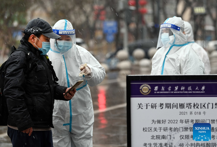 A staff member checks the nucleic acid test result of an examinee (1st L) for postgraduate entrance exams in Xi'an, northwest China's Shaanxi Province, Dec. 25, 2021. (Xinhua/Tao Ming)