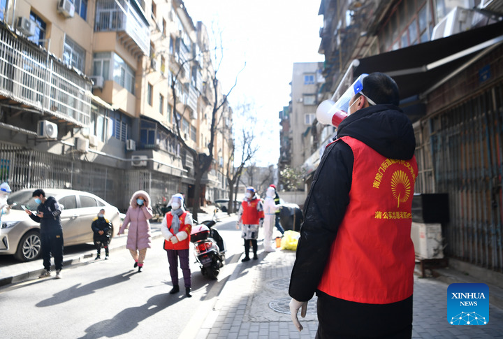 A volunteer informs residents to take nucleic acid test at a community in Xi'an, northwest China's Shaanxi Province, Dec. 29, 2021. (Xinhua/Zhang Bowen)