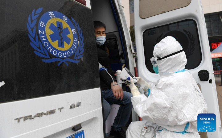 A medical worker checks on a patient transported by an ambulance at the 1st Affiliated Hospital of Xi'an Jiaotong University in Xi'an, northwest China's Shaanxi Province, Dec. 27, 2021. (Xinhua/Li Yibo)