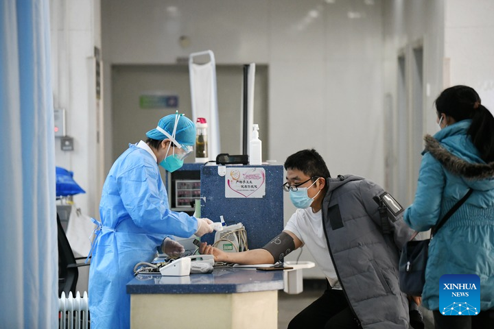 A medical worker examines a patient at the 1st Affiliated Hospital of Xi'an Jiaotong University in Xi'an, northwest China's Shaanxi Province, Dec. 27, 2021. (Xinhua/Li Yibo)