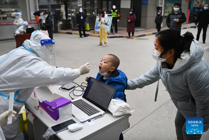 A kid receives nucleic acid test at a testing site in Xincheng District of Xi'an, northwest China's Shaanxi Province, Jan. 4, 2022.(Xinhua/Tao Ming)
