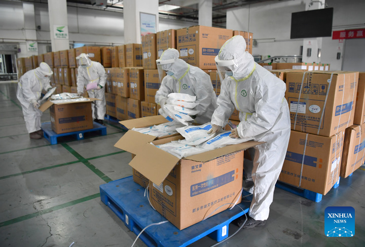 Staff examine epidemic prevention supplies at a pharmaceutical company in Xi'an, northwest China's Shaanxi Province, Dec. 28, 2021. (Xinhua/Shao Rui)