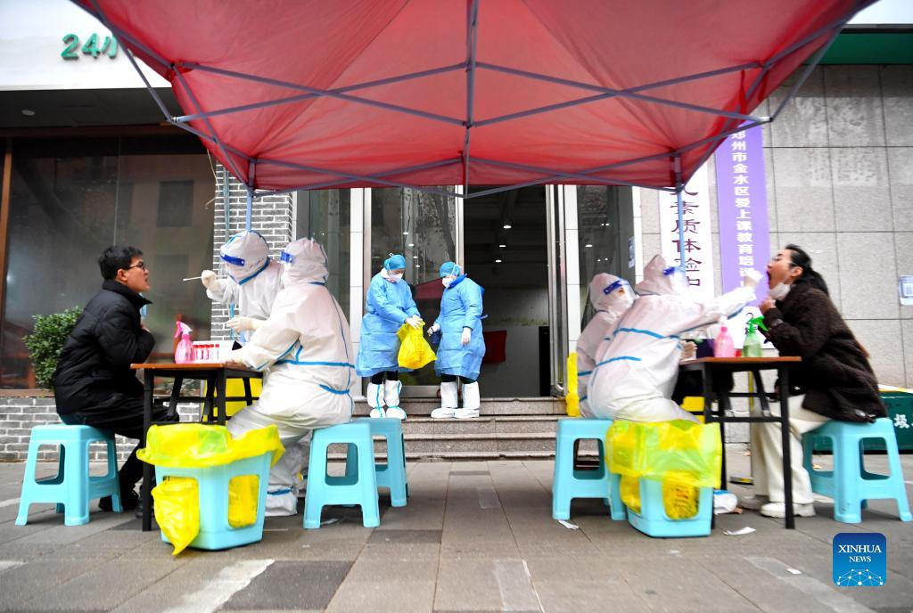 Medical workers take swab samples from citizens for nucleic acid test at a COVID-19 testing site in Zhengzhou, central China's Henan Province, Jan. 10, 2022.(Xinhua/Hao Yuan)
