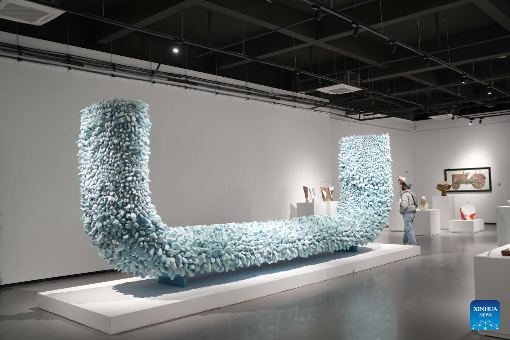 A visitor attends a preview of the Jingdezhen International Ceramic Art Biennale 2021 in Jingdezhen, east China's Jiangxi Province, Jan. 10, 2022. Themed "The Spirit of Ceramics," the biennale is scheduled to kick off on Feb. 28 and will last till March 18 this year, featuring 206 ceramic artworks from around the world. (Xinhua/Zhou Mi)