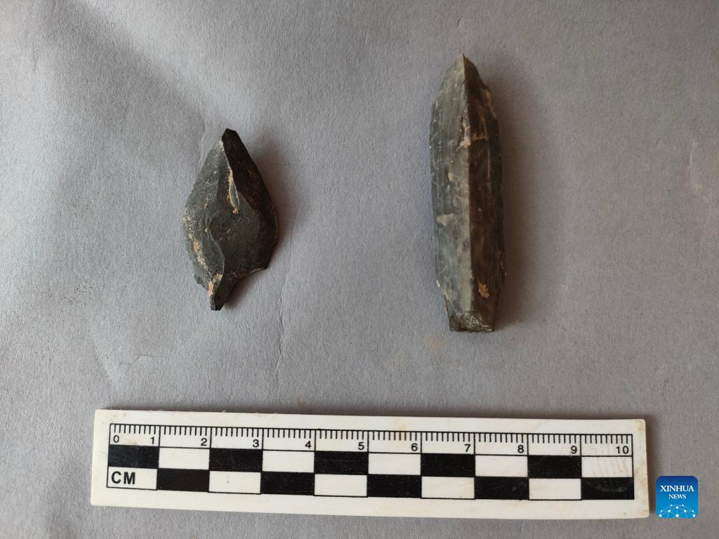 Undated photo shows stone artifacts found in the Sunjiagang site in Lixian County, central China's Hunan Province. Archaeologists have recently discovered new potteries and stone artifacts from a site dating back between 3,800 to 4,200 years in central China's Hunan Province, said the provincial cultural relics and archaeology research institute. TO GO WITH "Prehistoric relics unearthed in China's Hunan" (Xinhua)