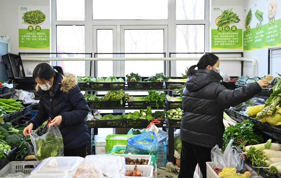 Residents select vegetables in a shop in north China's Tianjin, Jan. 11, 2022. (Xinhua/Li Ran)