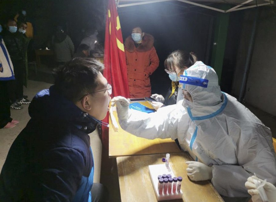 A medical worker takes a swab sample from a resident at a COVID-19 testing site in Baoliansi Township in Anyang, central China's Henan Province, Jan. 10, 2022. (Xinhua)