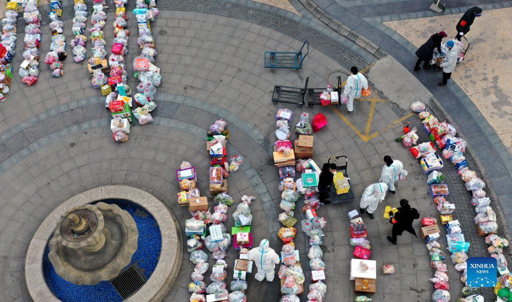 Aerial photo take on Jan. 12, 2022 shows government workers and volunteers preparing to deliver daily necessities to residents under home quarantine in Yanta District of Xi'an, capital of northwest China's Shaanxi Province. In Yuchang Sun City Community of Xi'an, 20 government workers who were sent to join the frontline staff working in the residential quarter and nearly a hundred volunteers are working against the clock to deliver daily necessities to residents under home quarantine. (Xinhua/Tao Ming)