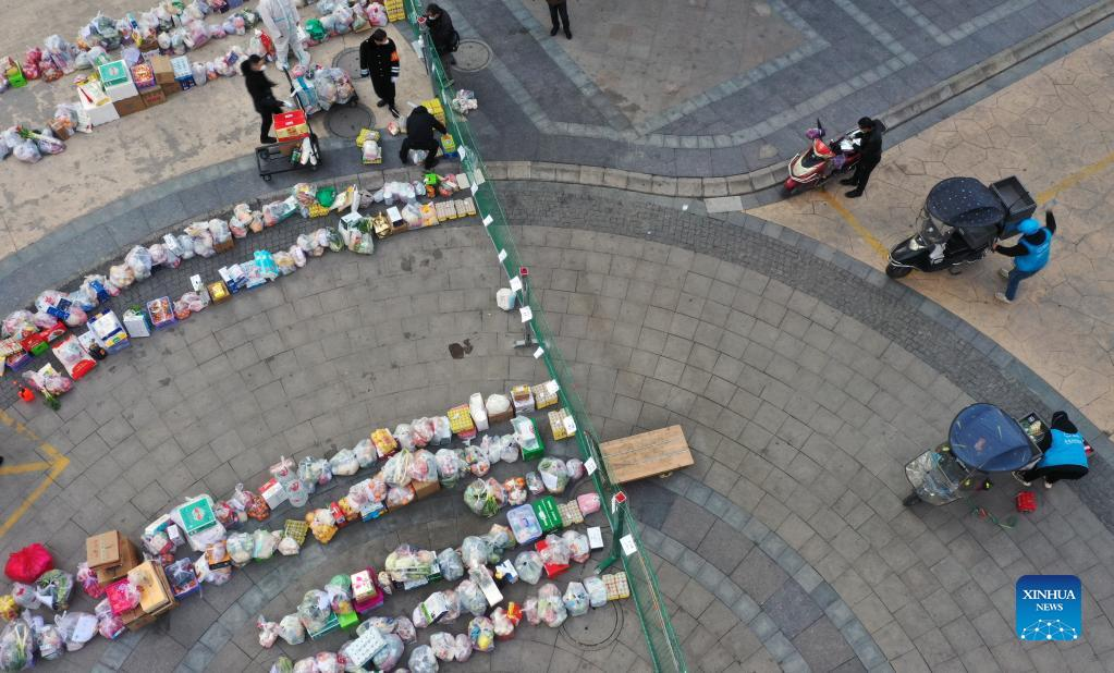 Aerial photo take on Jan. 12, 2022 shows government workers and volunteers receiving daily necessities ordered by residents under home quarantine in Yanta District of Xi'an, capital of northwest China's Shaanxi Province. In Yuchang Sun City Community of Xi'an, 20 government workers who were sent to join the frontline staff working in the residential quarter and nearly a hundred volunteers are working against the clock to deliver daily necessities to residents under home quarantine. (Xinhua/Tao Ming)