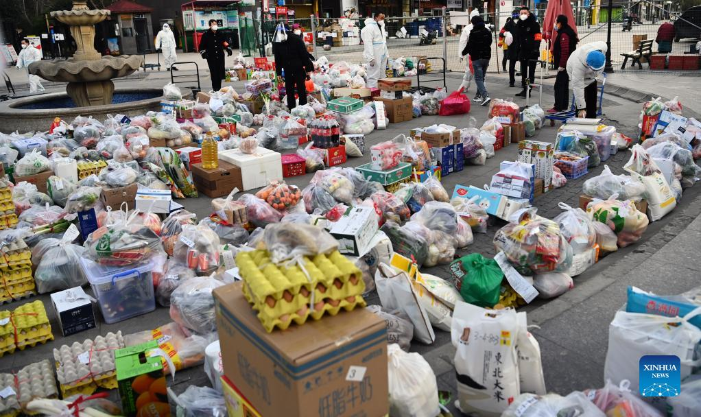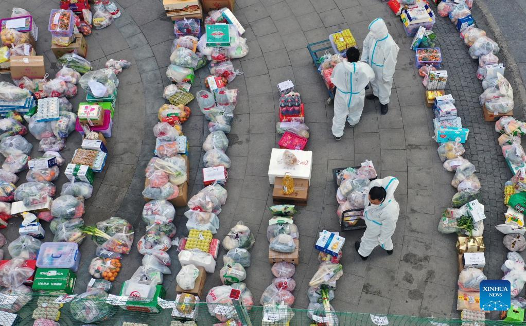 Government workers and volunteers prepare to deliver daily necessities to residents under home quarantine in Yanta District of Xi'an, capital of northwest China's Shaanxi Province, Jan. 12, 2022. In Yuchang Sun City Community of Xi'an, 20 government workers who were sent to join the frontline staff working in the residential quarter and nearly a hundred volunteers are working against the clock to deliver daily necessities to residents under home quarantine. (Xinhua/Tao Ming)