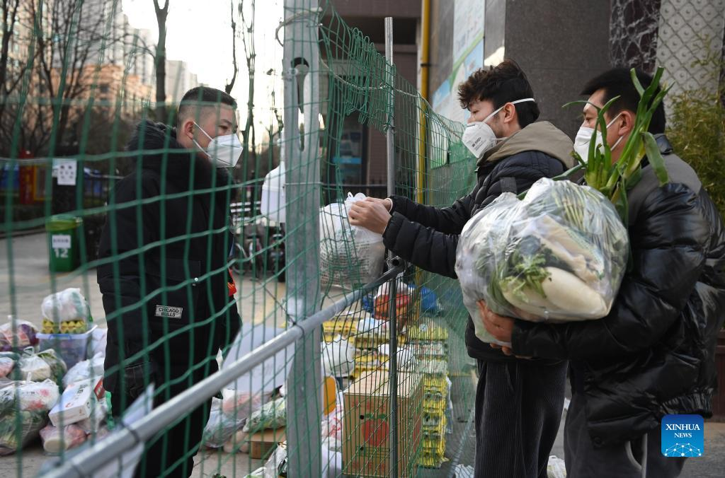 A volunteer (L) receives daily necessities ordered by residents under home quarantine in Yanta District of Xi'an, capital of northwest China's Shaanxi Province, Jan. 12, 2022. In Yuchang Sun City Community of Xi'an, 20 government workers who were sent to join the frontline staff working in the residential quarter and nearly a hundred volunteers are working against the clock to deliver daily necessities to residents under home quarantine. (Xinhua/Tao Ming)