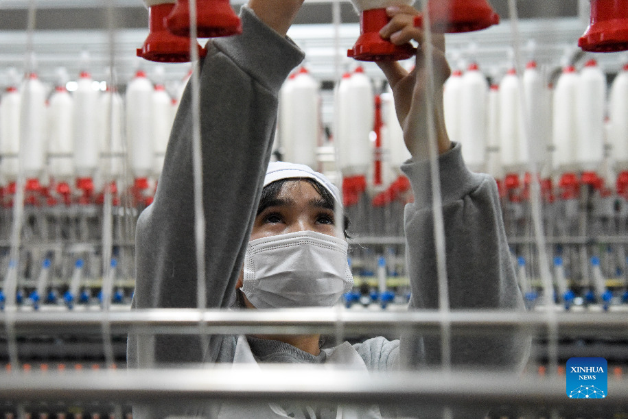 A staff member works in a textile factory at the integrated industrial park in Moyu County of Hotan, northwest China's Xinjiang Uygur Autonomous Region, Jan. 11, 2022. Located on the southern brim of the Taklimakan Desert, Moyu was once an impoverished county with little arable land and weak industrial foundation. In recent years, Moyu County made efforts to attract investment as the booster of industrial development, constantly optimizes the industrial structure, and builds an integrated industrial park with the whole industrial chain of hosiery and electronics, effectively promoting economic development and increasing the income of local people. Up to now, the integrated industrial park in Moyu County has settled 17 enterprises and has offered more than 3,000 jobs. (Xinhua/Ding Lei)