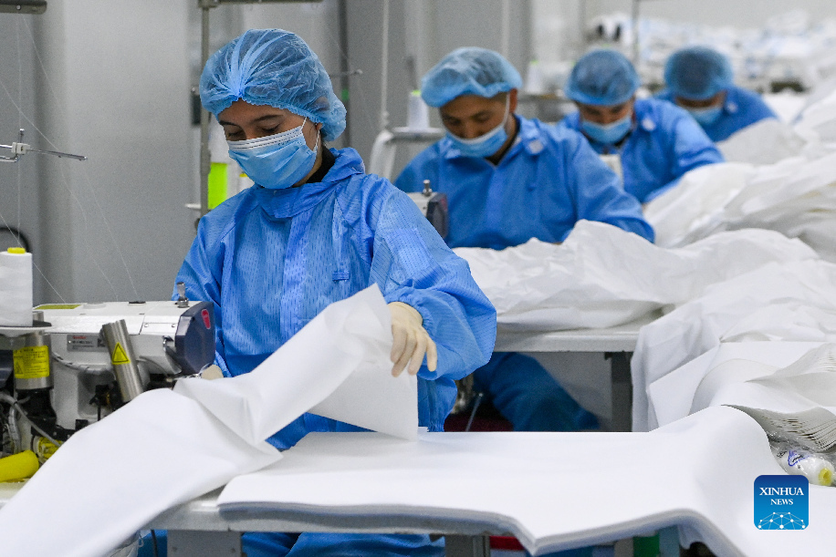 Staff members work in a medical equipment factory at the integrated industrial park in Moyu County of Hotan, northwest China's Xinjiang Uygur Autonomous Region, Jan. 11, 2022. Located on the southern brim of the Taklimakan Desert, Moyu was once an impoverished county with little arable land and weak industrial foundation. In recent years, Moyu County made efforts to attract investment as the booster of industrial development, constantly optimizes the industrial structure, and builds an integrated industrial park with the whole industrial chain of hosiery and electronics, effectively promoting economic development and increasing the income of local people. Up to now, the integrated industrial park in Moyu County has settled 17 enterprises and has offered more than 3,000 jobs. (Xinhua/Ding Lei)