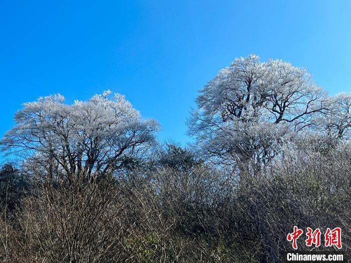 Photo taken on January 11, 2022 shows that rime appears on the upper part of a mountain in Guangxi Zhuang Autonomous Region, while the lower part remains emerald. (Photo: China News Service/Liang Qiang)