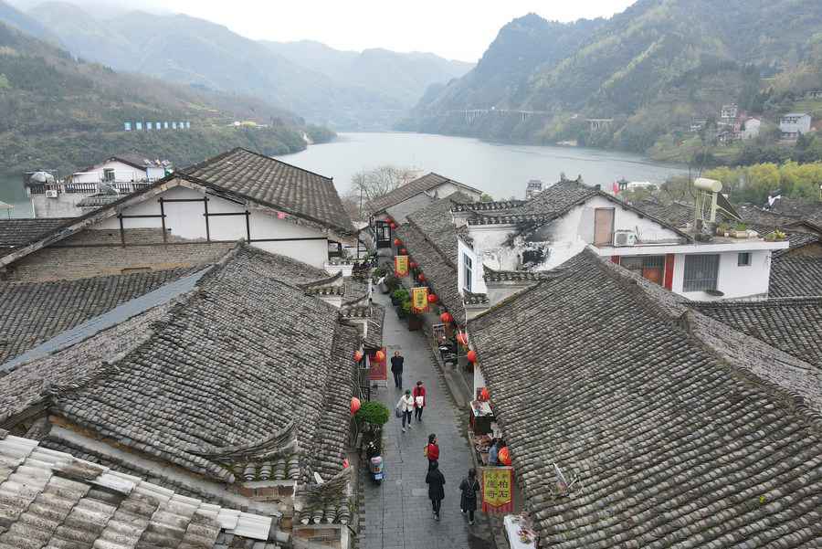 Aerial photo taken on March 19, 2021 shows tourists visiting the ancient Houliu Township in Shiquan County of Ankang City, northwest China's Shaanxi Province. (Xinhua/Shao Rui)