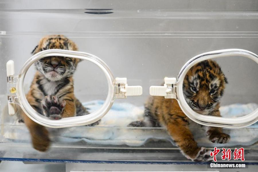 Two South China tiger cubs are in good shape in an incubator at a nature reserve in Shaoguan of south China’s Guangdong Province, January 12, 2022. (Photo: China News Service/Chen Jimin)
