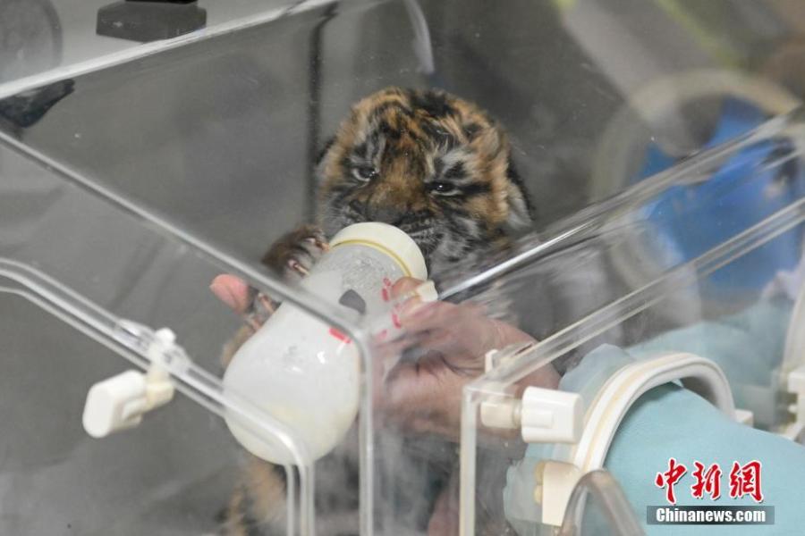 The care worker feeds one cub with the formula, January 12, 2022. (Photo: China News Service/Chen Jimin)