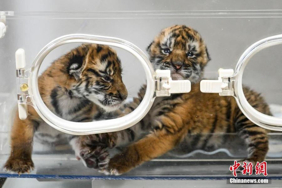 Two South China tiger cubs are in good shape in an incubator at a nature reserve in Shaoguan of south China’s Guangdong Province, January 12, 2022. (Photo: China News Service/Chen Jimin)