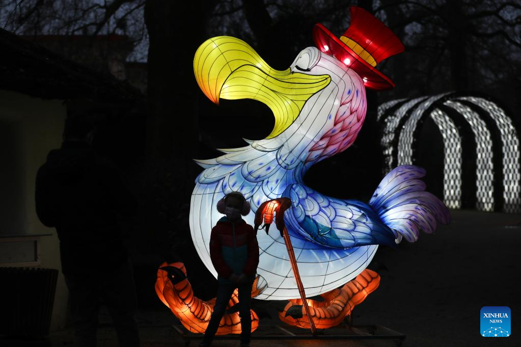 People view light installations during the sixth edition of China light festival themed "Alice in Wonderland" at the Antwerp Zoo in Antwerp, Belgium, Jan. 12, 2022. (Xinhua/Zheng Huansong)