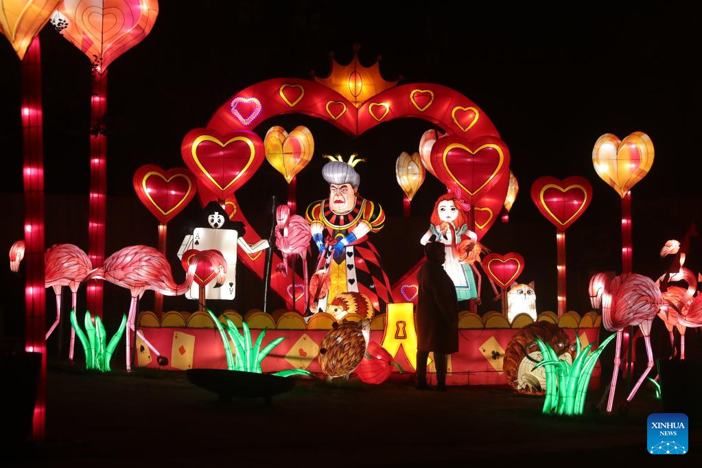 A light installation is pictured during the sixth edition of China light festival themed "Alice in Wonderland" at the Antwerp Zoo in Antwerp, Belgium, Jan. 12, 2022. (Xinhua/Zheng Huansong)