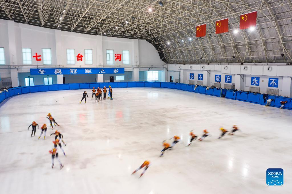 Aerial photo taken on Jan. 10, 2022 shows students of a vocational college taking part in short track speed skating training at Qitaihe Sports Center in Qitaihe City, northeast China's Heilongjiang Province. To date, six of China's 13 Winter Olympic gold medals have been claimed by athletes trained in Qitaihe City. The city has been stepping up efforts to train winter sports talents in recent years by building schools that teach short track speed skating, setting up training base for provincial sports team, as well as holding ice and snow sports events. (Xinhua/Xie Jianfei)