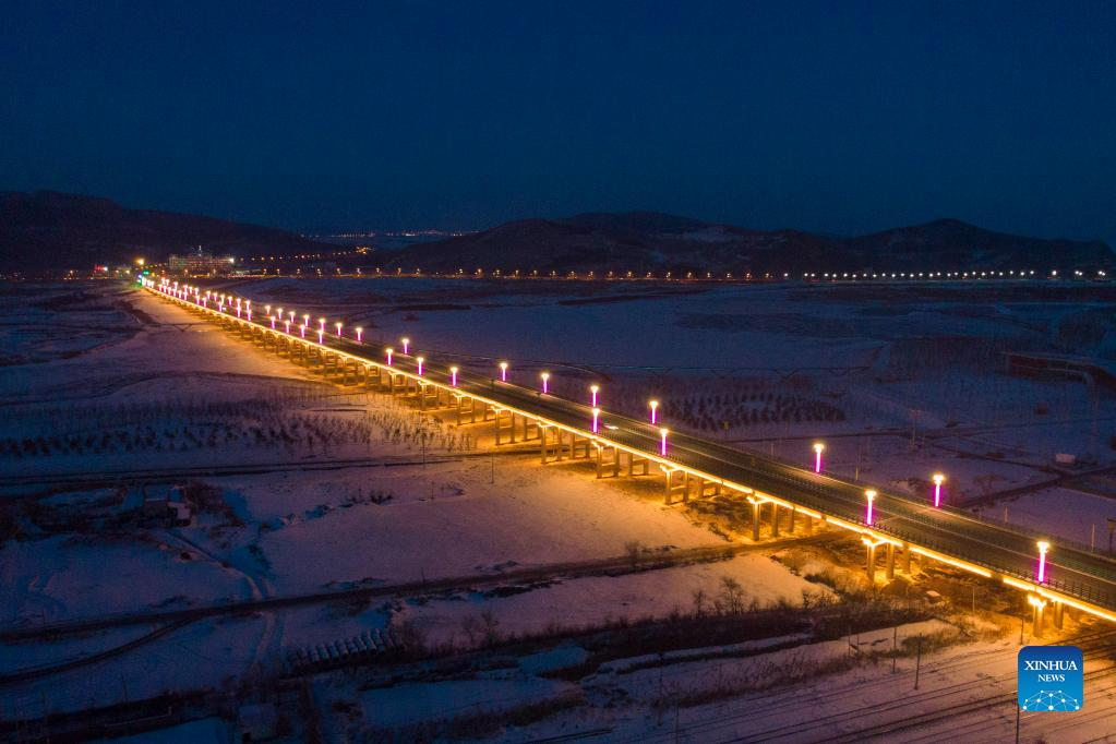 Aerial photo taken on Jan. 12, 2022 shows the "champion bridge" in Qitaihe City, northeast China's Heilongjiang Province. To date, six of China's 13 Winter Olympic gold medals have been claimed by athletes trained in Qitaihe City. The city has been stepping up efforts to train winter sports talents in recent years by building schools that teach short track speed skating, setting up training base for provincial sports team, as well as holding ice and snow sports events. (Xinhua/Xie Jianfei)